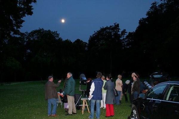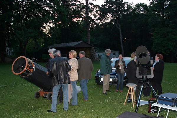 Einmal mehr bauen wir unsere Station, bestehend aus dem 10" LX200GPS und dem 18" Obsession Dobson, auf. Der Himmel ist, abgesehen von hohen Schleierwolken, überraschend klar. Die dunklen Regenwolken, die noch zu Beginn des Kurses bedrohlich am Himmel standen, haben sich verzogen. Es ist, jahreszeitlich bedingt, noch sehr hell, doch Mond und Jupiter stehen malerisch über dem Park des Springerschlössl.