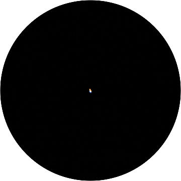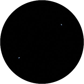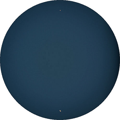 Durch eine kreisförmige Maske kann ich den Eindruck im 50mm Okular nachstellen. Die Vignettierung bei f/3.3 ist leider enorm, ich kann sie aber teilweise kompensieren, indem ich die Aufnahme als ihr eigenes Flatfield verwende (ich radiere einfach die Planeten aus). Ganz geht es aber leider nicht. Etwas später sieht man das Doppelgestirn Mars-Saturn schon mit freiem Auge, zusammen mit Castor und Pollux, die im Nordwesten gerade noch zu sehen sind.