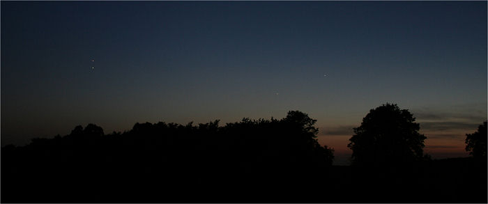 Saturn und Mars (links) mit Castor und Pollux (rechts von der Bildmitte knapp über den Bäumen)