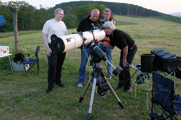 Zwei Dinge stehen heute auf dem Programm dieser Astropraxis. Zum einen Merkur und die restlichen Planeten des Abends - es gibt heute eine Begegnung von Mars und Saturn. Zum anderen Meade Autostar. Der geplante Workshop wurde auf den Abend verlegt. Die lange Dämmerung würde viel Zeit bei Tageslicht geben, um Probleme zu lösen, und der klare Himmel würde zur Praxis einladen. Viele kommen heute mit Teleskopen, allein: Nur ein einziges ETX mit Autostar I, sonst durchwegs ältere LX200 mit Magellan, etliche Celestrons, diverse Exoten und auch Dobsons. Aber - keines mit Autostar II. So kann es einem gehen ...