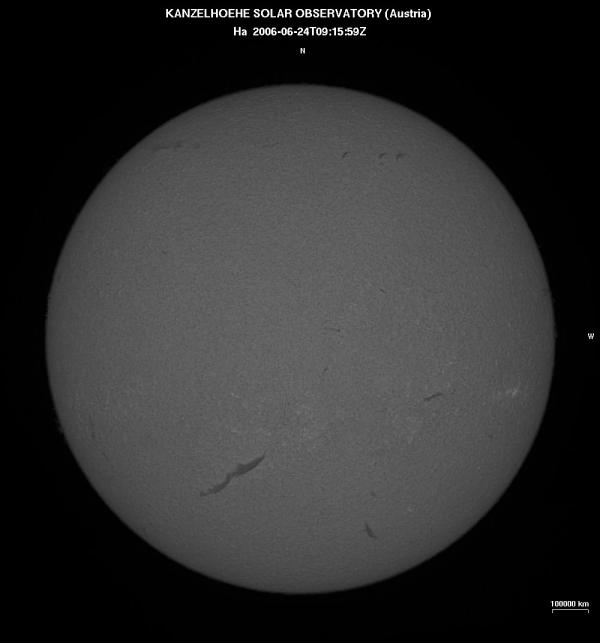 | Bericht: | Das Praktische am Coronado PST ist, dass man das Gerät samt Stativ ganz schnell hinaus tragen kann, um damit die Sonne zu beobachten. Auf diese Weise habe ich in den letzten Wochen immer wieder einmal einen Blick zur Sonne gemacht. Meist sind einige kleine, ganz nette Protuberanzen zu sehen. Spektakuläre Dinge waren aber nicht dabei. Heute Mittag gab es auch wieder einige kleine Protuberanzen. Doch viel interessanter war ein Filament auf der Sonnenoberfläche, das sich wie die Schwingen eines riesigen Vogels in zwei duklen Bögen über die hellere Sonnenscheibe spannte. Das Bild von der Kanzelhöhe zeigt dieses Filament und noch einige kleinere.