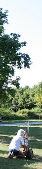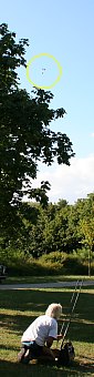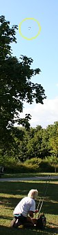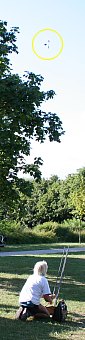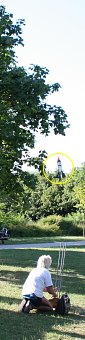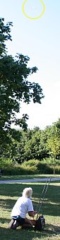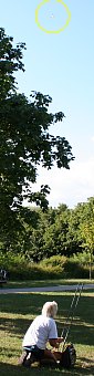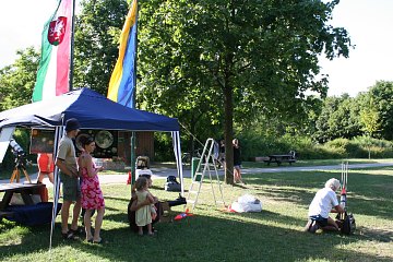 Ein Doppelfernrohr zur Beobachtung der Sonne im Weißlicht (Baader-Folie) und Hα (Coronado PST) ist ein erster Publikumsmagnet, leider spielt die Sonne nicht mit. Sie zeigt sich gänzlich fleckenfrei, wenigstens eine kleine Protuberanz ist zu sehen. Es muss eine andere Attraktion her, zumal auch dichtere Wolken durchziehen: Raketen!