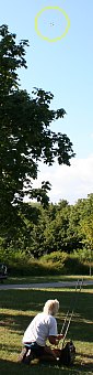 Ein ganz guter Flug, und das nur mit Luft als Antrieb, noch kein Wasser. Nach der Landung fehlt eine Stabilisierungsflosse. Auf den Aufnahmen des Fluges erkennt man aber, dass diese Flosse vielleicht schon beim Start beschädigt wurde und daher auch für die eigenartige, korkenzieherförmige Bahn verantwortlich zeigt. Toll: Ein WAA-Raketen-Flare (Bild 4 und 5): Die Sonne spiegelt sich am Boden der Plastikflasche, die den Raketenkörper bildet.