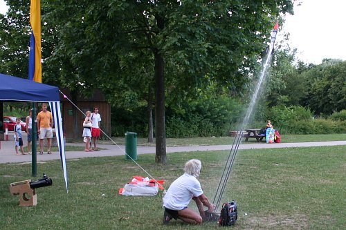 Viele erwarten gebannt den ersten Start; wie weit wird die Rakete wohl fliegen?