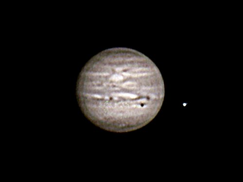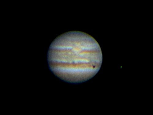 Hans Peter Müllner mit seinem Astrophysics-Refraktor und ich sind heute hier, um unter klarem Himmel auszuloten, was die Canon EOS 350D so kann. Doch zunächst ist es noch zu hell für schwächere Objekte und Jupiter ein lohnendes Ziel. Ein Schattenvorübergang von Io und eine Passage des GRF sind zweifellos ein sehr attraktives Programm auf dem Riesenplaneten. Daher kommt zunächst die Webcam am 12" LX200 zum Einsatz, mit 1,5-fach Barlowlinse, also einer Brennweite von 4,5m. Das Seeing ist durchaus gut und daher kommen viele Details heraus, auch bei noch hellem Dämmerungshimmel.