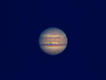 Schon etwas zuvor habe ich Jupiter ebenfalls mit der Webcam aufgenommen, bei F=3m und je 1200 Bilder, von denen ich alle stacke. Der Himmel ist zum Zeitpunkt der Aufnahmen noch recht hell.