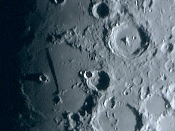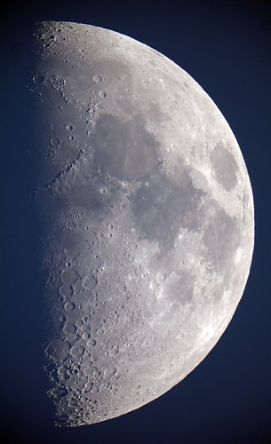 Der Mond steht in einer sehr schönen Viertelphase und einige bekannte Formationen stehen so nahe dem Terminator, dass sie wirklich unglaubliche Details zeigen. Ich halte den Mond zunächst in der Totalen fest.