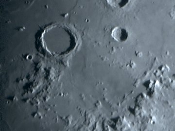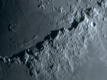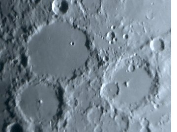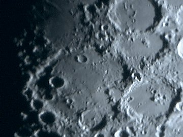 Trotz nicht so optimalem Seeings zücke ich die Webcam und nehme ein paar Formationen mit F=3m (f/10) und Infrarot-Passfilter auf; jeweils 300 Bilder, von denen ich die besten 30 - 40 stacke. Beim Mond reicht das.
