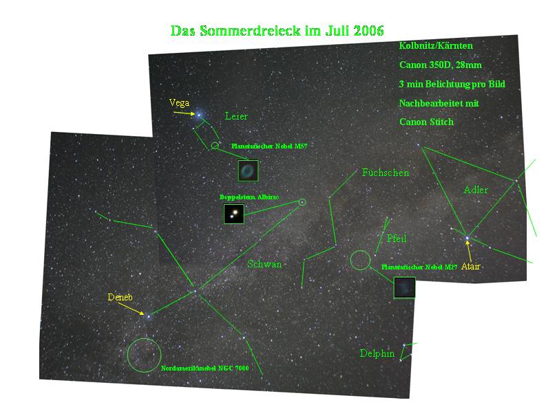 | Bericht: | Hallo Freunde der dunklen Nacht! Ich habe mich im Urlaub als Fotographeur der Milchstrasse versucht. Im ersten Bastelversuch habe ich zwei Bilder überlagert, dannach kommentiert und mit Bildausschnitten anderer Astroaufnahmen garniert. Hoffentlich gefällt's! Es lebe der Schwan!