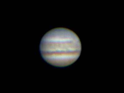 | Bericht: | Nach längerer Zeit ist der Abend heute ganz brauchbar. Jupiter steht schön am Dämmerungshimmel, und auch das Seeing ist gar nicht so schlecht, gemessen an der schon recht geringen Höhe des Planeten. Da geht sich sogar noch eine Aufnahmeserie mit der Webcam auf, bei einer Brennweite von 4,5m.