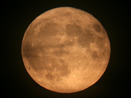Dünne Horizontwolken erzeugen immer wieder abgeschwächte Streifen auf dem Mond. Die Südbreite ist bei diesem Vollmond nicht mehr so extrem wie im Juni und Juli, dennoch zeigt der Mond im Fernrohr noch einen sehr deutlichen Nordterminator.