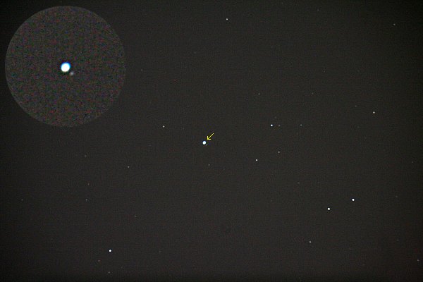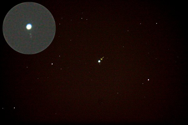 Jetzt überrascht es mich nicht, dass auch die beiden hellsten Uranusmonde, Titania und Oberon, gut zu erkennen sind (rund 14 mag). Man beachte die Lage! Das Uranussystem steht nächstes Jahr in Kantenstellung, das passiert nur alle 42 Jahre. Und da macht sich die Achsneigung von 98° deutlich bemerkbar. Die drei Aufnahmen waren ganz einfach, eigentlich fast Schnappschüsse. Und mit einem 8" Instrument muss man halt statt 20 vielleicht 30 Sekunden belichten. Spätestens jetzt erscheint es ganz und gar unverständlich, dass populäre astronomische Jahrbücher die Monde von Uranus und Neptun einfach verschweigen. Aber dafür gibt es ja Starry Night und ähnliche Programme. |