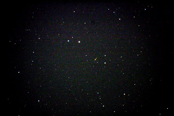 Ich verkürze die Brennweite auf f/6.3 und los geht's. Mit 1600 ISO und 20 Sekunden Belichtungszeit ist der ferne Planet (?) ganz gut zu sehen. Der Rest ist Ebenenausgleich, um das helle Hintergrundlicht wegzubekommen. Ich identifiziere Pluto mit TheSky und verifiziere die Position sicherheitshalber noch mit dem Ephemeris Generator des JPL, aber die Positionen stimmen überein. Charon wird ein spezielles Projekt werden. Mit rund 16 mag gar nicht so schwach, aber nur maximal eine Bogensekunde von Pluto entfernt! Ob das zu schaffen ist mit Amateurgeräten? Jetzt mache ich mich, eigentlich nur "scherzhalber", an Uranus und Neptun. Bei dem Seeing sind Aufnahmen mit der Webcam sinnlos und sie würden ohnedies nur die kleinen Scheibchen zeigen. Also nehme ich nur die Sternfelder rund um die beiden Planeten mit der EOS 350D auf. Dann aber ist die Überraschung groß.