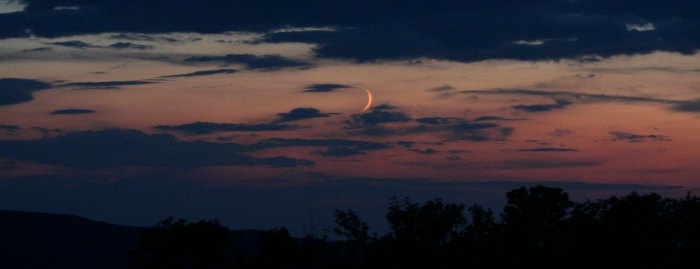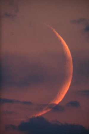 Mitten in dem bunten, klaren Streifen steht die dünne Sichel des zunehmenden Mondes. Was für ein Anblick! Rasch das Fernrohr zum Mond schwenken.