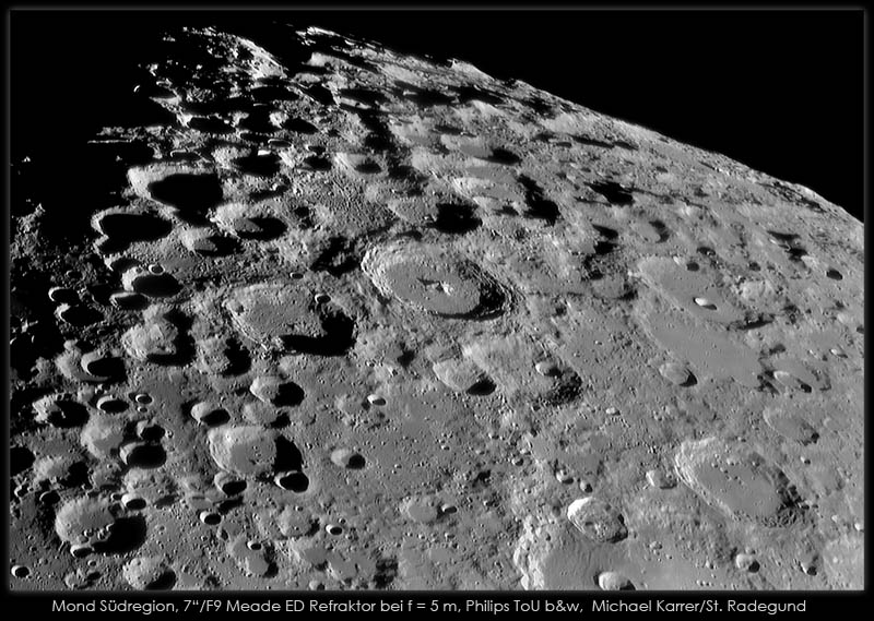 | Bericht: | Ein 9 teiliges Mosaik bei guter Luftruhe der Mond Südregion, zentriert um den Krater Moretus. Modifizierte schwarzweiss ToUcam. Bild in voller Auflösung unter angeführtem link.