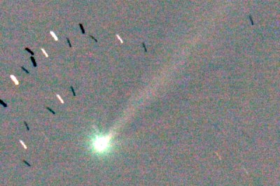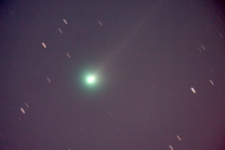 Die Bewegung des Kometen ist deutlich, der Schweif auch. Ich habe herausgefunden, wie ich die - bedingt durch die azimutale Montierung - auch gedrehten Bilder am bewegten Kometen zentrieren kann. Es geht mit AstroArt und dem Präprozessor in zwei Durchgängen: Im ersten entdrehen, im zweiten zentrieren. Eigentlich ganz einfach.
