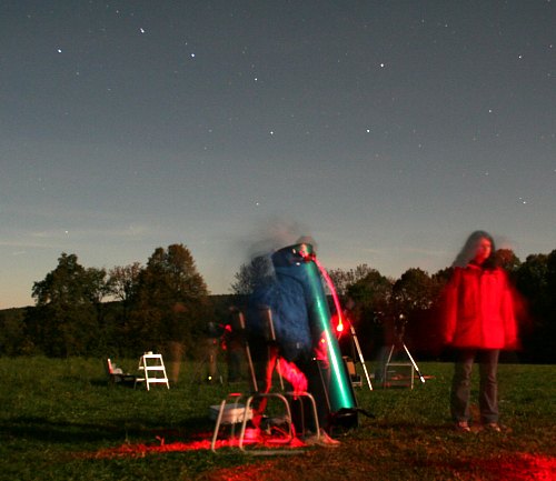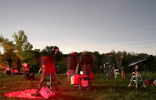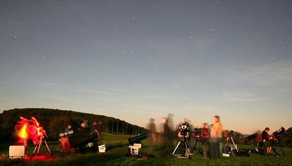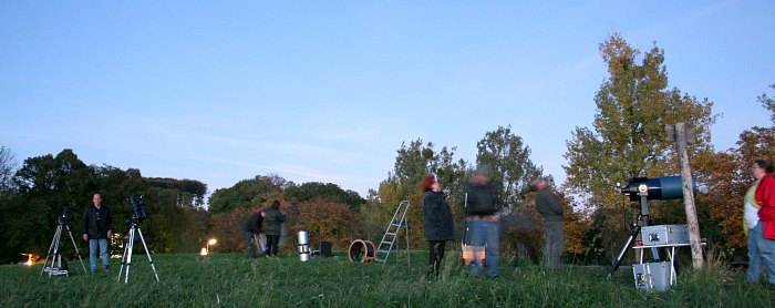 In der hellen Dämmerung bauen viele ihre Teleskope auf, 12 werden es heute wieder.