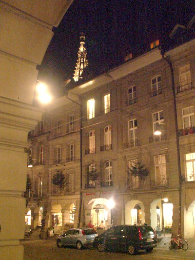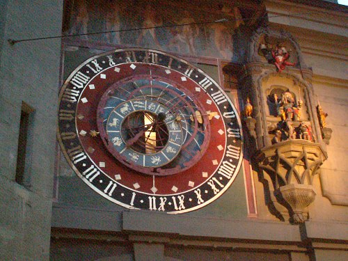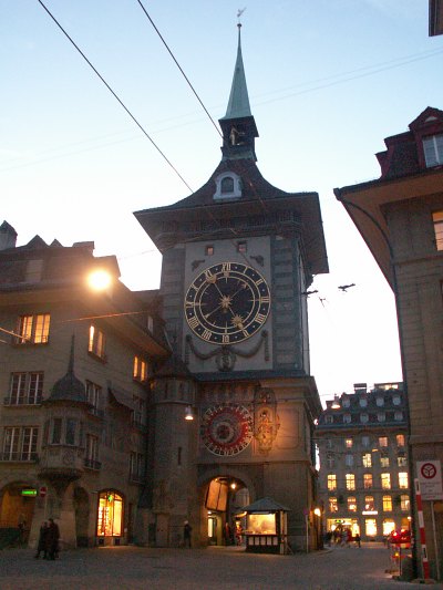Die Zeit reicht leider nicht für einen Besuch der Universitätssternwarte in Muesmatt (siehe http://www.sternwarten-bern.ch/) und auch ein Vortrag der Astronomischen Gesellschaft Bern (http://bern.astronomie.ch/) steht nicht auf dem Programm. Trotzdem gibt es zwei lohnende Ziele. Ziel Nummer 1 ist die Zytglogge ("Zeitglocke"). Über sie schreibt Wikepedia: "Der Zytgloggeturm (Zeitglockenturm) bildete das alte westliche Stadttor von Bern über dem er aufragt. Erbaut 1191, war es bis 1256 das erste Westtor und bildete einst den Abschluss der ersten Stadterweiterung. Durch die Entwicklung der Stadt rückte der Turm mit jeder Erweiterung immer mehr ins Zentrum der Stadt. Für einige Zeit ist der Turm gar als Frauengefängnis genutzt worden. Nach dem grossen Brand von 1405, der nahezu die gesamte Stadt in Schutt und Asche legte, wurde er zum "Zytglogge" umfunktioniert. An seiner Ostseite ist ein sehr schönes Glockenspiel angebracht, u.a. mit Figuren von Bären und, hoch oben im Dach des Turms, einem Ritter in voller Rüstung. Dieses Glockenspiel wird 4 Minuten vor der vollen Stunde in Bewegung gesetzt, es ist ein wahres Meisterwerk der mittelalterlichen Uhrmacherkunst."