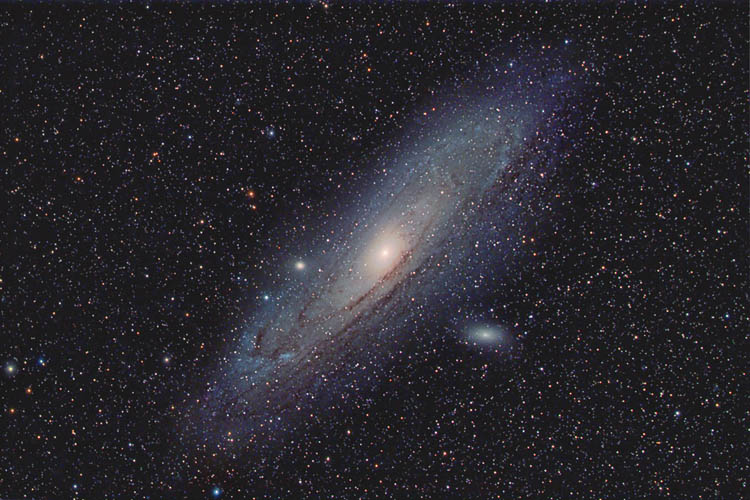 | Bericht: | Gute Bedingungen gaben Gelegenheit meine Neuerwerbung ernsthaft zu testen. Es ist die QHY8, eine chinesischer 'SXV-M25C - Klon'. Sie verwendet den gleichen Sony-Sensor wie die Nikon D50, hat eine zweistufige Peltierkühlung, und benutzt eine so genannte Kältefalle, um die Restfeuchtigkeit innerhalb des Kameragehäuses darauf 'auszufrieren'. Dadurch ist die Konstruktion weniger aufwändig und dementsprechend kostengünstig. Durch die gute Kühlung und den guten Eckdaten des Sensors besitzt die Kamera eine sehr geringes Eigenrauschen, wodurch sich die Anwendung von Dunkelbildern erübrigt. Aber nun genug der Worte, hier das Ergebnis: es ist die grosse Galaxie M31 in Andromeda, die bei der benutzten Brennweite von 384mm voll auf den Chip passt.