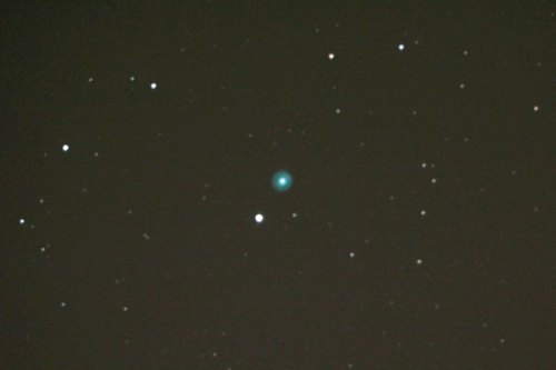 Ich wende mich zwei Planetarischen Nebeln zu. Es stellt sich heraus, dass knapp 2m viel zu wenig Brennweite für diese Objekte ist. Aber mehr ist wegen der Nachführung nicht drin. Es bleibt also bei einem ersten Abtasten. NGC 2022 ist ebenfalls weitgehend unbekannt, ein kleiner Ringnebel mit bipolarer Struktur im -- Orion. Auch hier ist die Konkurrenz durch andere Deep Sky Objekte gnadenlos. Der Eskimo-Nebel NGC 2392 in den Zwillingen ist größer, aber für Details fehlt es auch hier an Brennweite. Man beachte die kurze Belichtungszeit!