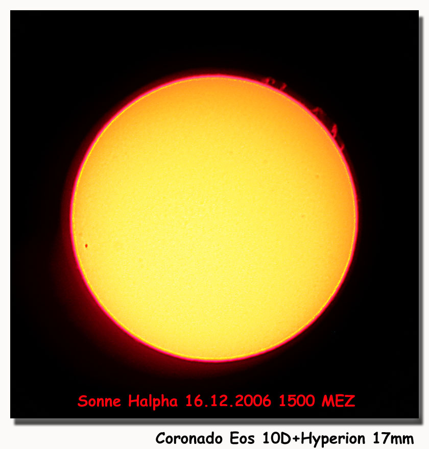 Nachdem herrliches ??Winterwetter?? herrscht (zweistellige Plusgrade, kein Schnee) wollte ich in meiner Sternwarte nur mal ganz kurz das neu erworbene Hyperion Okular von Baader am PST versuchen. Schnell mal die Kuppel geöffnet, das 17mm Hyperion als Projektiv für die Canon EOS 10D auf das PST geschraubt und los gehts! Gleich die ersten Probeaufnahmen zeigen eine recht aktive Sonne mit jeder Menge großer Protuberanzen. Wirklich eine Pracht - und Astronomie am Tag so zwischendurch mit derart imposanten Ansichten ist ja wirklich auch nicht zu verachten!