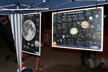 Dazu haben wir eine Flotte von Teleskopen unterschiedlicher Größe mitgebracht. Alle nach Dobson-Bauart, denn die Kinder sollen die Instrumente ruhig angreifen können, auch die ganz großen. Wenn der Mond oder ein Stern nicht mehr zu sehen ist, dürfen die Kinder selbst versuchen, ihn wieder "einzufangen". Natürlich helfen wir dabei, denn so einfach ist das am Anfang auch nicht.
