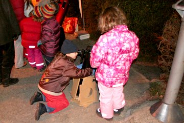 Die Kinder beginnen mit dem kleinsten Fernrohr. Es ist ein ganz normales Kaufhausteleskop, allerdings mit einer von uns gebastelten, stabileren Montierung. Ein Fernrohr unter 100 Euro, ideal für Kinderhände. Unfassbar, dass im Handel auch mit schwer verständlicher Elektronik vollgestopfte Instrumente für Kinder empfohlen werden; das nimmt die Freude an der Astronomie schon im Anfangsstadium. Junge Menschen sind Forscher von Natur aus und wollen - und sollen! - alles selbst erleben und sich nicht ihren Weg zu den Sternen von einem Computer vorgeben lassen. Solche Instrumente sind ausschließlich für Fortgeschrittene.