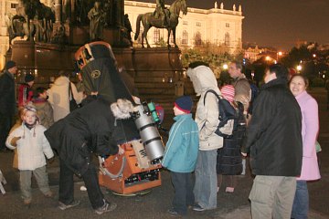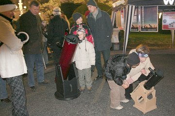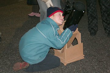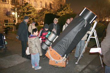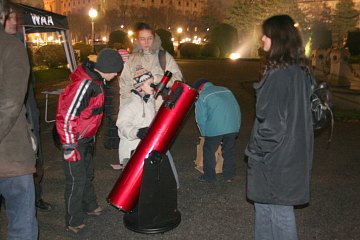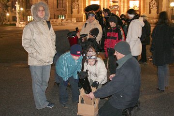 Ansonsten spielen wir das gleiche Programm wie vorgestern auf dem Cobenzl. Wir erklären Fernrohre und beobachten mit Teleskopen unterschiedlicher Größe. Mond, der helle Stern Capella im Furhmann, die Pleiaden und sogar der Orionnebel stehen auf dem Programm. Spielend lernen Kinder den Umgang mit unseren Dobsons - einmal mehr zeigt sich, wie geeignet dieser Instrumente für Kinderhände sind.