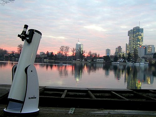 | Bericht: | Die strahlend sonnigen Wetteraussichten während des Vormittages ermutigten mich, auch einmal nach dem Kometen McNaught Ausschau zu halten. Natürlich schwirrte dieses Objekt wieder einmal in der "falschen" Himmelsrichtung herum, so dass es von der Terrasse aus nicht zu sehen sein würde. Da wir jedoch an diesem prächtigen "Wintertag" eine Rudertour beschlossen hatten, schleppte ich den Dobson samt Fotoausrüstung kurzerhand in den Ruderklub mit. Dort zeigte sich am späten Nachmittag der Himmel bereits ziemlich bewölkt, aber da noch knapp eine Stunde Zeit war, baute ich recht zuversichtlich meinen Dobson auf.