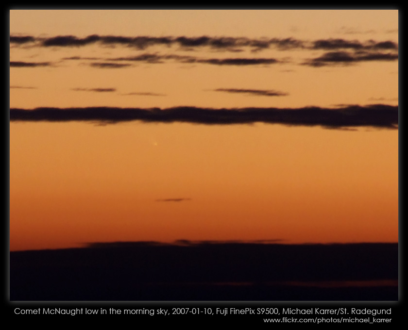 | Bericht: | Obwohl die Morgensichtbarkeit schon unattraktiv ist, ist der Komet zu ungewöhnlich, um ihn nicht bei allen sich bietenden Gelegenheiten aufzusuchen. Zwischen einem null Grad Horizont und stationärer, dichter Föhnwolke blieb ein rund zwei Grad breiter Steifen mit äußerst klarer Durchsicht frei. Kurz vor 7 Uhr kann ich ihn mit dem 8x50 auffinden: Ein heller Kopf mit ca. 10 Bogenminuten Schweif! Gerade in der extremen Situation dieser Beobachtung freue ich mich umso mehr ihn gesehen zu haben. Das Foto dient mehr dem Nachweis. Die beeidruckende Abendsichtbarkeit dieses Tages fiel leider berufsbedingt aus.