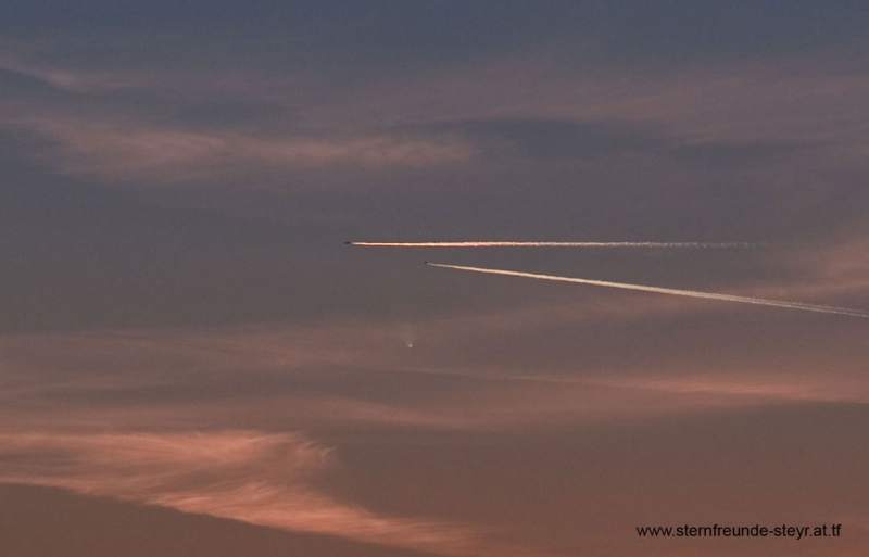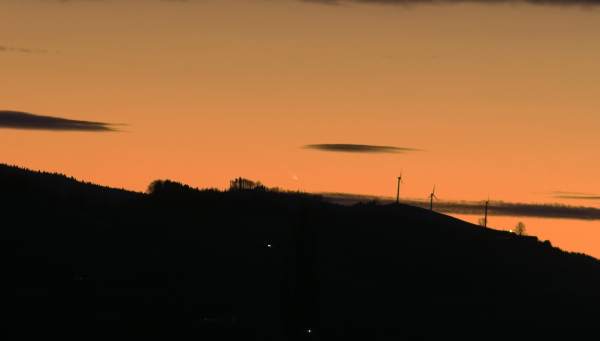 Ich war am 10.01. so begeistert von dem Anblick dieses schon freisichtigen Schweifes das ich ganz vergessen hab manuell scharf zu stellen. Durch den Umbau der 10D mit Baader Filter funktioniert der Autofokus nicht mehr! Deshalb leider leicht unscharfe Bilder. 13.01.2007 Aufnahme noch vor Sonnenuntergang mit 1/1000sec Belichtungszeit. Diesmal aber das 200 mm Tele richtig fokussiert.