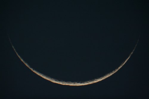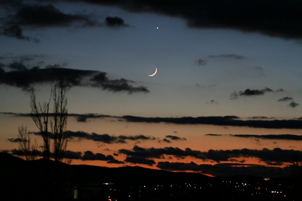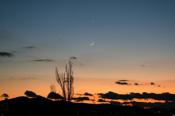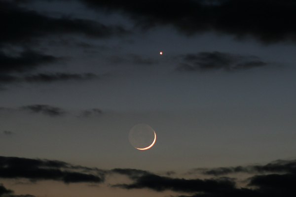 Es gibt nicht viele Himmelsanblicke, die man einfach nur als "schön" bezeichnen muss. Eine enge Begegnung der Venus mit dem Neulicht gehört aber sicher dazu. Ich fühle mich wie ein babylonischer Priester auf seinem Tempelturm, der die vorhergesagte Begegnung von Ishtar und Sin zufrieden beobachtet. Die Konstellation ist einfach umwerfend schön. Bald ist die ganze Mondscheibe zu sehen. Kein Wunder, ist doch das aschgraue Mondlicht unmittelbar nach Neumond am hellsten - auf dem Mond leuchtet ja die noch fast volle Erde, hundert Mal so hell wie bei uns der Vollmond.