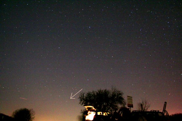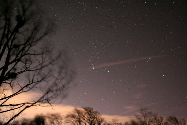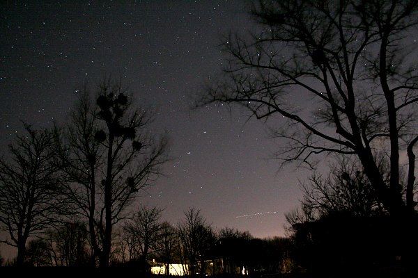 ... obwohl er schon tief steht, und all die anderen Sehenswürdigkeiten am Winterhimmel (ist ja gleichzeitig Astropraxis zu diesem Thema). Ein Blick zum Kleinen Wagen verrät eine scheinbare visuelle Grenzgröße von 5 mag. Nicht schlecht für diesen Ort. Und erst viel später zeigt sich auf einer an sich verworfenen Aufnahmen, mit unästhetisch starker Nachverstärkung, eine kleine Sensation: Schweifstrahlen des Kometen McNaught, kaum von der Hintergrundaufhellung zu unterscheiden und fast schon zu tief.