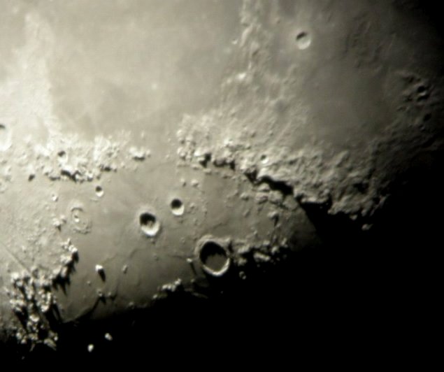 | Bericht: | Es war eiskalt, verstärkt durch den heftigen Wind der den Dobson ordentlich durchbeutelte, und ein grausliches Seeing. Aber der Halbmond stand am wolkenlosen Himmel und so nützte ich schnell die Gelegenheit, meine neue kleine Kompaktkamera auszuprobieren. Die alte C 760 hatte brave Dienste geleistet, vor allem im Makro- aber auch Telebereich, und mich um die halbe Welt begleitet. Aber da sie nicht mehr produziert wird, wollte ich sie zur Sicherheit für das Unterwassergehäuse schonen. Deshalb legte ich mir ihre Nachfolgerin zu, die mit über 7 Megapixel (mehr als das Doppelte der alten Kamera) schon recht gut ausgestattet ist. Also stellte ich mich vermummt auf die Terrasse und versuchte mit der ungewohnten Kamera im Dunkeln zurecht zu kommen. Es wurden jedoch nur 8 Aufnahmen, da mir bereits nach 15 Minuten die Finger fast abfielen und weder der heftige Wind noch das miserable Seeing einen Anreiz boten, der eisigen Kälte zu trotzen. Aber für diese Verhältnisse wurden die Aufnahmen einigermaßen passabel.