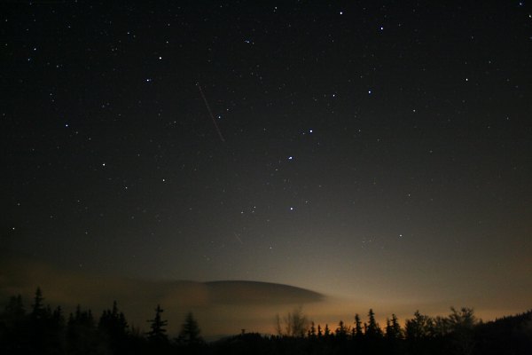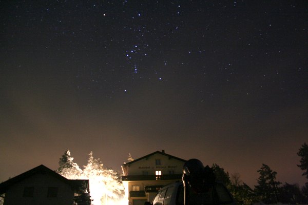 Tief im Norden liegt eine Föhnwolke, harmlos. Darüber ist der Himmel klar. Nur dieser Wind ... Im Süden steht Orion hoch, doch halt, da fehlt doch was! Wo bitte ist Sirius? Da liegt eine Stauwolke, vom heftigen Wind gegen die Hohe Wand gedrückt. Manchmal höher, so dass Orion halb verschwindet, manchmal weg. Aber bitte so geht das nicht. Sturm, Flugschnee und dann noch eine Wolke. Nein. Unsere kleine Gruppe beschliesst, den Berg zu verlassen. Am Fuße der Hohen Wand, nahe der Ortschaft Dreistätten, finden wir einen dunklen Beobachtungsort. Der Wind bläst immer noch gnadenlos, doch der Himmel ist klar.