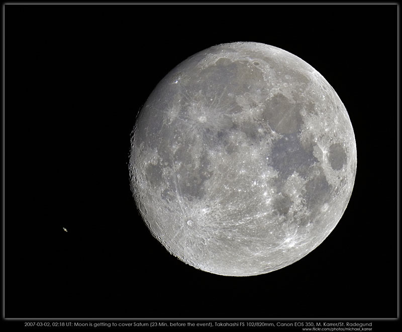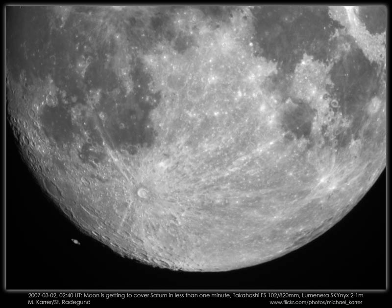 | Bericht: | Dass die dichte Wolkendecke wirklich Lücken bekam, war eine echte Überraschung. Dass sie genau zum Zeitpunkt der Planetenbedeckung wieder so dicht wurde um nichts mehr zu sehen war dagegen leicht frustrierend. Die SKYnyx Kamera ermöglichte es mir, während der laufenden Filmsequenz die Belichtung anzupassen. So konnte ich die heranziehende Wolkenschicht unmittelbar vor Bedeckungsbeginn etwas ausgleichen. Dank Registax werden die vorüber ziehenden Wolkenschleier ausgemittelt, sodass man den Eindruck eines klaren Himmels haben könnte. Saturn und der Mond wurden unterschiedlich belichtet und mit Hilfe der Bildbearbeitung angeglichen. Das Seeing war der instabilen Wetterlage entsprechend schlecht.