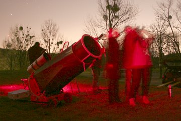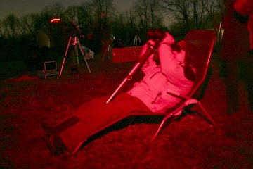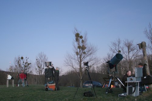 Wir beobachten jetzt visuell so ziemlich alles, was an Deep Sky Objekten in dieser Region zu sehen ist, von den tief stehenden Pleiaden und Orionnebel über die Löwegalaxien bis zum ersten Kugelsternhaufen der Saison, M3. Zehn Instrumente sind gegen den Himmel gerichtet. Wir haben schon lange nicht beobachtet.