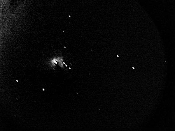 | Bericht: | Gutes Seeing, klarer Himmel und Zeit - was will man mehr. Also pack ich meine Sachen und fuhr zu meinem Beobachtungsplatz im Weinviertel! Als Erstes standen Venus und Orion auf dem Programm. Da anfangs meine Optik noch nicht ausreichend ausgekühlt war, konnte ich Venus nur mit geringer Vergrößerung beobachten. Leider war nicht viel erkennbar. Bei Orion war das schon anders! Orion war gut sichtbar, man konnte bei mittlerer Vergrößerung (ca. 125x) schöne Strukturen des Nebels erkennen - obwohl die Optik noch in der Auskühlphase war. Das Trapez war sehr gut erkennbar! Obwohl etwas ungewöhnlich (Dobson ohne Nachführung und kurzer Belichtungszeit), versuchte ich einige Photos des Orionnebels mit einer handelsüblichen Digitalkamera. Ergebnis: Auch mit einfachsten Mitteln und ein wenig Geduld gelangen einige Aufnahmen auf denen man etwas erkennen konnte, wie das folgende Bild zeigt:
