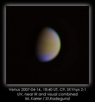 14.4.2006: Der Falschfarbendarstellung ist ein Experiment, unterschiedliche Wellenlängen zu einem RGB Bild zu kombinieren. Blau: UV Schüler Filter, Rot: Astronomik 742 IRpass Filter, Grün: Meade gelbgrün Filter.