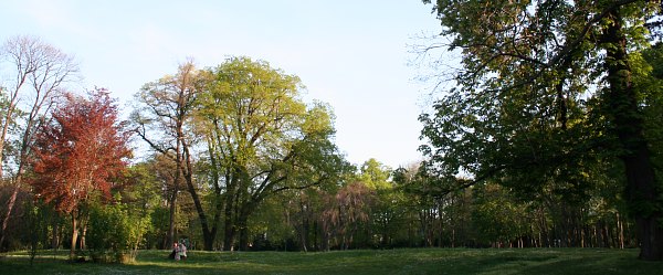 April-Abend unseres Kurses "Erlebte Astronomie, Teil 3 - ein Jahr Sternenhimmel". Der schöne Park des Springerschlössl liegt im sanften Licht eines schon fast frühsommerlichen Abends.