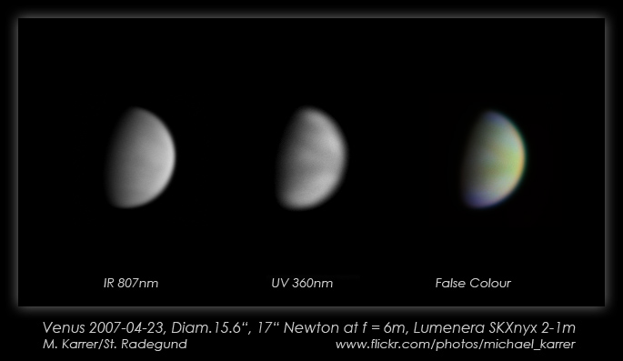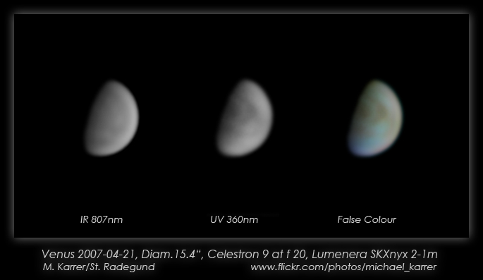 | Bericht: | Aufnahmen vom 21.4. und 23.4. 2007 Venus macht richtig Spass. Erst recht, wenn sogar im nahen IR Bereich leichte Wolkenstrukturen sichtbar werden.