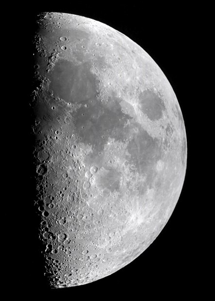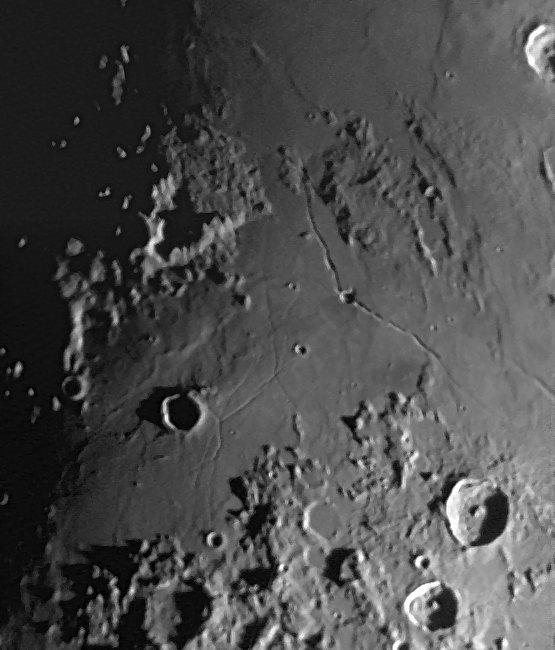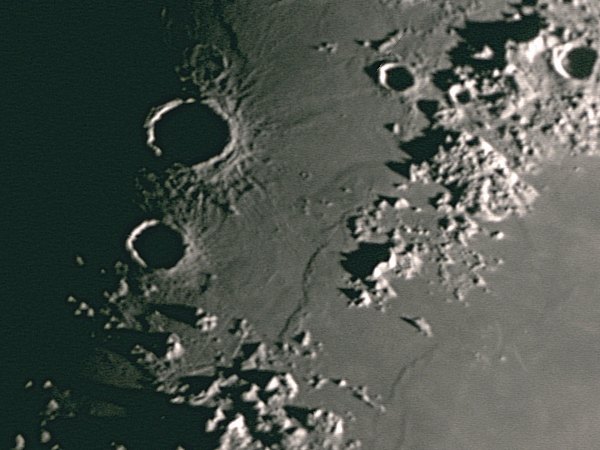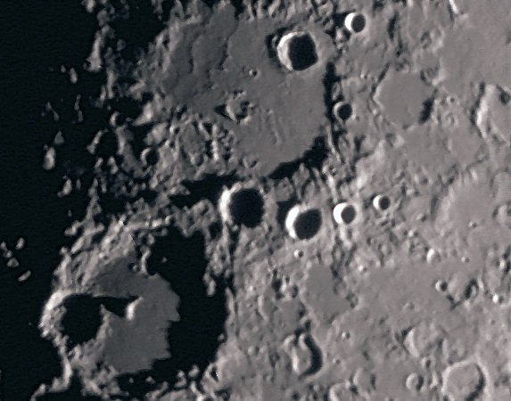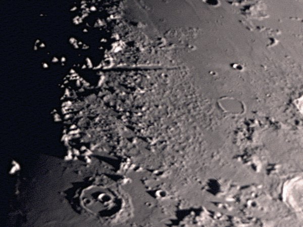 | Bericht: | Der Mond steht hoch am Himmel in schöner Phase. Frühling, das ist die Jahreszeit des zunehmenden Mondes. Die Sterne funkeln, das lässt auf kein allzu gutes Seeing hoffen. Ein Blick durchs Okular zeigt aber, dass es nicht ganz sinnlos ist. Zunächst einmal Mond in der Totalen. Am 12" LX-200 bei f/10 muss ich auch in dieser Phase ein Mosaik aus drei Bildern machen (1/50s bei 200 ISO).