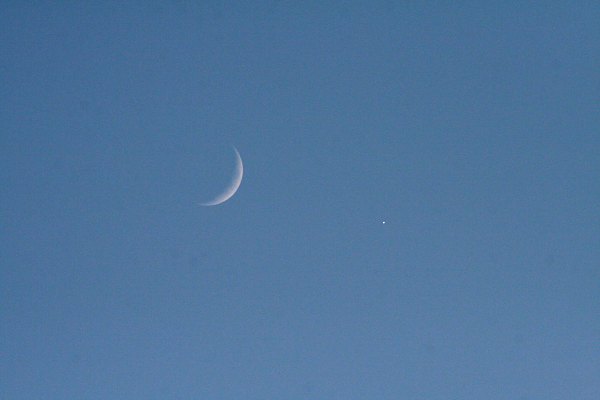 Das wenige, was ich vom Himmel sehe, zeigt auch Wolken, leider in genau der Richtung des Ereignisses. Ob es jemand schaffen wird? Rund zweieinhalb Stunden später gibt ein Wolkenloch den Blick auf Mond und Venus frei. Beide Gestirne sind trotz hellem Sonnenscheins mit freiem Auge einwandfrei zu erkennen.