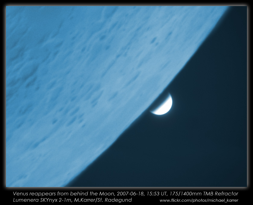 | Bericht: | Freisichtig und unglaublich hell im Vergleich zur Mondsichel erscheint Venus schon vor der Bedeckung. Während des Eintritts filmte ich mit der SKYnyx durch dichte Cirrusbewölkung. Es hat mich gewundert, dass trotzdem etwas zu sehen war. Beim Austritt war es klar. Die fotografische Herausforderung lag in der hohen Helligkeitsdifferenz der beiden Körper. Nach 34 Jahren Astronomie für mich ein erstmaliges, wirklich beeindruckendes Ereignis!