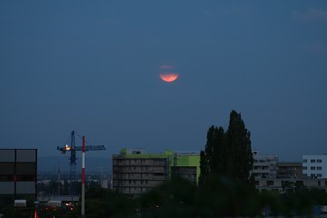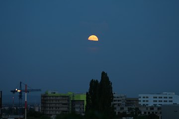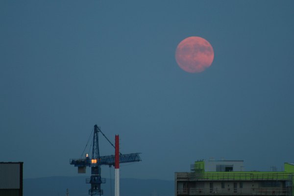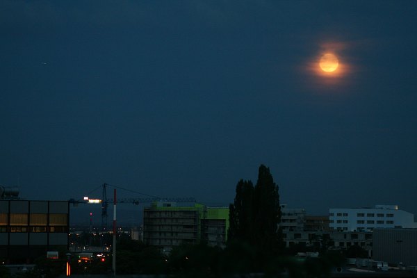 ... dann geht der Mond hinter Dunst und Wolken auf, äußerst malerisch, trotz des urbanen Vordergrunds.