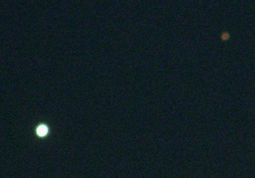 Aber dann, gegen 22 Uhr, Überraschung-Überraschung, tat sich plötzlich ein Wolkenloch auf und die beiden Planeten prangten am Himmel. Venus in strahlendem Weiss, Saturn in Gelb-Orange. Unvorbereitet packten wir schnell die Kameras und hielten das Ereignis fest, aus der Hand, ohne Stativ oder sonstige Hilfsmittel. Die meisten Aufnahmen wurden ordentlich verwackelt, aber eine gelang doch ohne Zick-Zack-Muster.