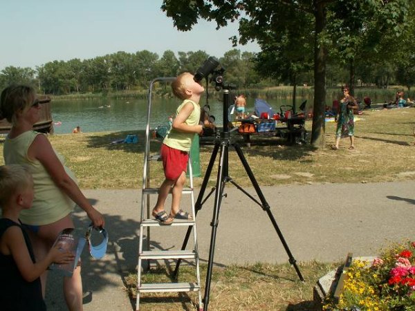 | Bericht: | Venus am Schotterteich. Der weithin bekannte Badeteich der Langenzersdorfer "Seeschlacht"genannt gibt Gelegenheit zu einer multifunktionellen Aktion. Anstatt faul in der Sonne zu liegen, stelle ich einen Feldstecher auf und berechne den Stand der Venus, nicht ohne das vorher entsprechend anzukündigen. Nach kurzer Zeit finden sich zahlreiche Interessenten ein.
