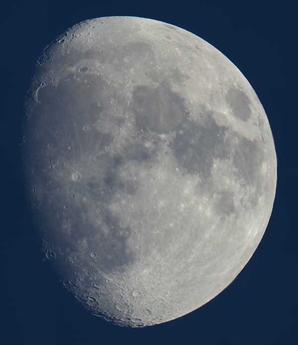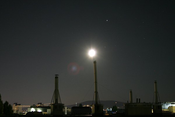Dass der Mond 6° südliche ekliptikale Breite hat, ist angesichts einer Mondbahnneigung von 5° 14' sehr erstaunlich. Das "etwas mehr" verdanken wir noch der Horizontalparallaxe, die sich in der Nähe des Horizonts, wie der Name schon sagt, am größten auswirkt und die in Summe noch einmal rund 1° ausmachen kann. Klar, dass sich heute auch keine Antaresbedeckung ausgeht. τ Scorpii ist zum Zeitpunkt der Aufnahme allerdings bedeckt! Ein Blick zum Mond durchs Fernrohr: