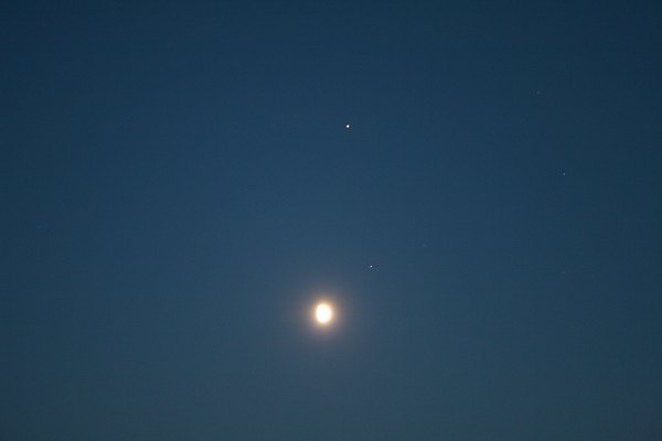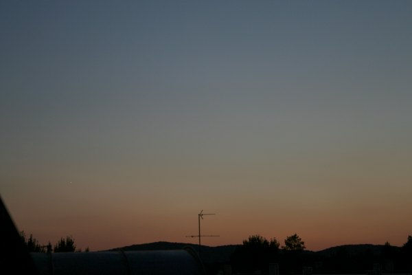 Venus ist nur mehr in der hellen Dämmerung zu sehen, aber es geht noch. Sie ist keine aufällige Erscheinung mehr, aber mit ein wenig Suche ist sie durchaus noch zu finden. Sogar im 10x50 Feldstecher erkennt man schon ihre Sichelform. Auf der "anderen Seite" des Himmels, im Süden, steht heute eine wunderschöne Konstellation aus Jupiter, Antares und Mond (von Norden nach Süden).