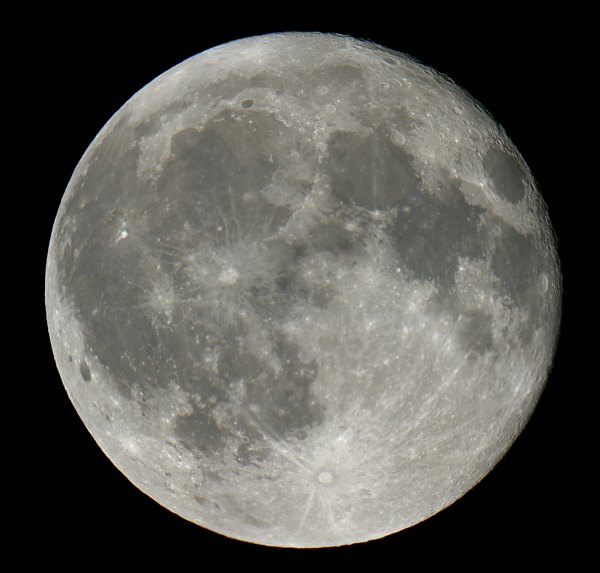 Der fast noch volle Mond geht im Südosten auf. Schon erkennt man Terminatordetails.